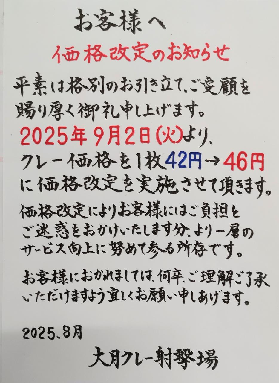 9/1(月)定休日。2(火)クレー価格のみ改定。T.S両面共に通常一般営業。(T.S共にISSF公式セット)